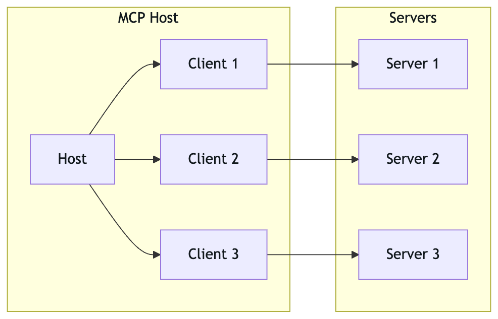 每个 MCP Host 可以运行多个 MCP Client 实例,形成 1:N 的关系。